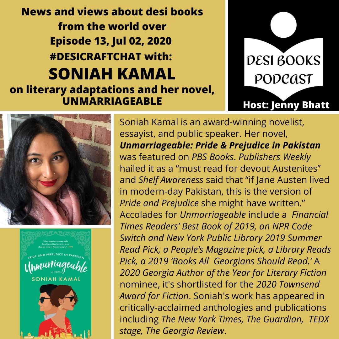 In today’s episode, in addition to the usual roundup of new notable desi books, short stories, poems, essays, interviews, awards, and more, we have Soniah Kamal discussing the art and craft of the literary adaptation. Soniah’s latest novel, Unmarriageable, is a contemporary retelling of Jane Austen’s Pride and Prejudice.