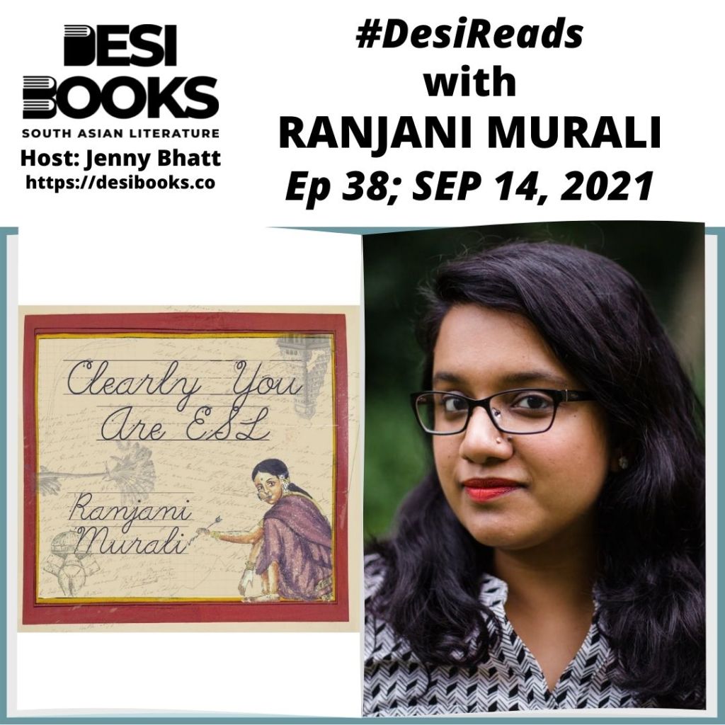 You’ve been listening to episode 38 of Desi Books—news and views about desi literature from the world over. I’m your host, Jenny Bhatt. Thank you for tuning in. Today’s #DesiReads segment was from Ranjani Murali reading from their new poetry collection, Clearly You Are ESL.