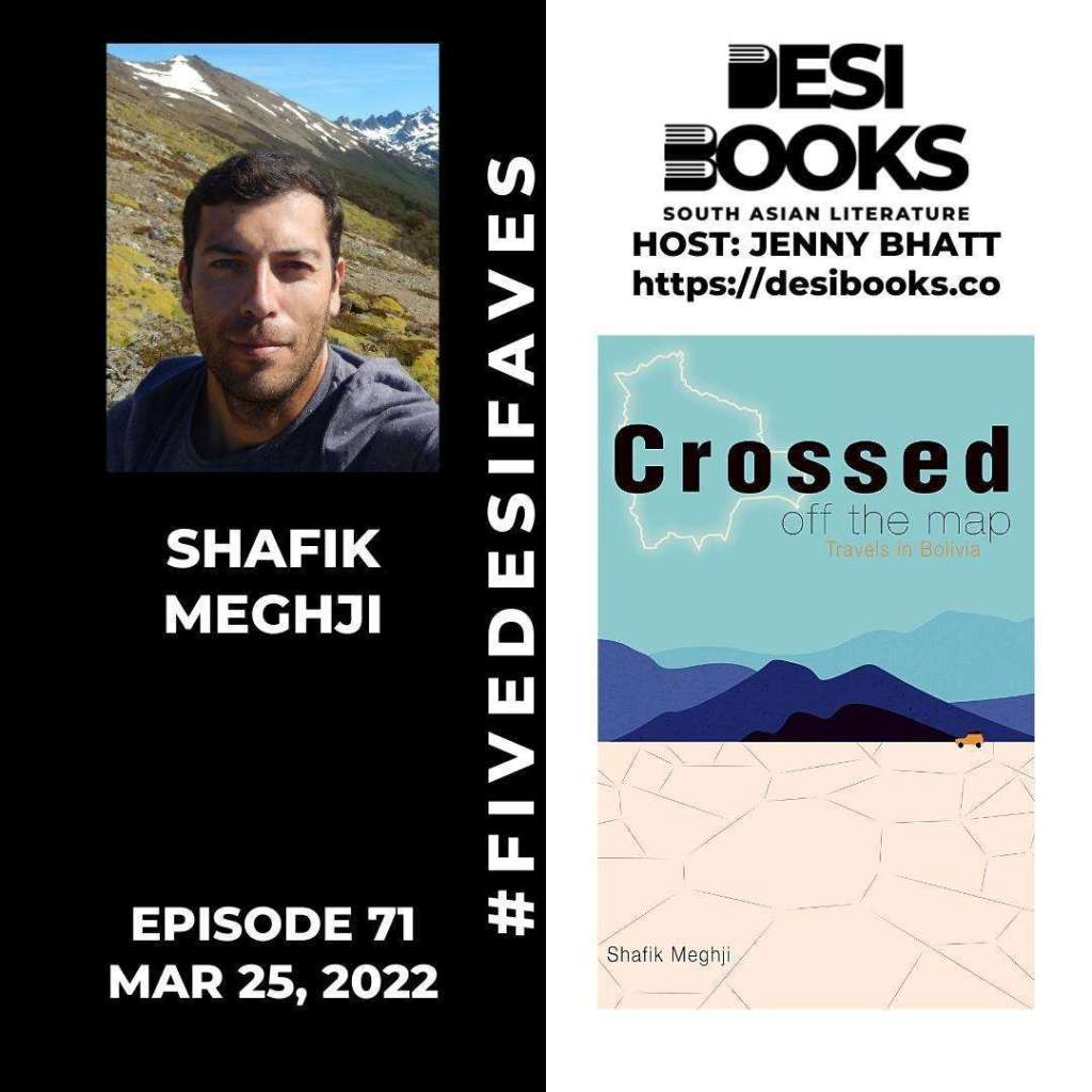 Today, in the #FiveDesiFaves segment, we have Shafik Meghji, who has a new book out: Crossed off the Map: Travels in Bolivia. He discusses the five desi books that have influenced and inspired his work. Spanning travel, science writing, and fiction, these are by Pico Iyer, Sonia Shah, Monisha Rajesh, Tharik Hussain, and Arundhati Roy.